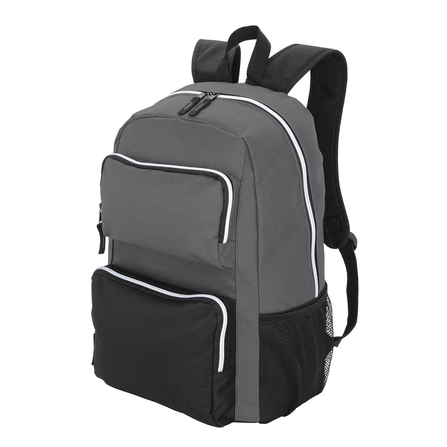 Stay organized with our roomy laptop backpack crafted with 50% post-consumer recycled polyester and recycled PVB. This detailed bag features ample storage, including a zippered main compartment with dual zippers, two front zippered pockets, and side mesh pockets. With a padded laptop/tablet sleeve, a fully padded back panel, and padded, adjustable straps, this everyday bag is designed to meet all your carrying needs with comfort in mind. 11.8125″ W x 17.6875″ H x 6.3125″ D