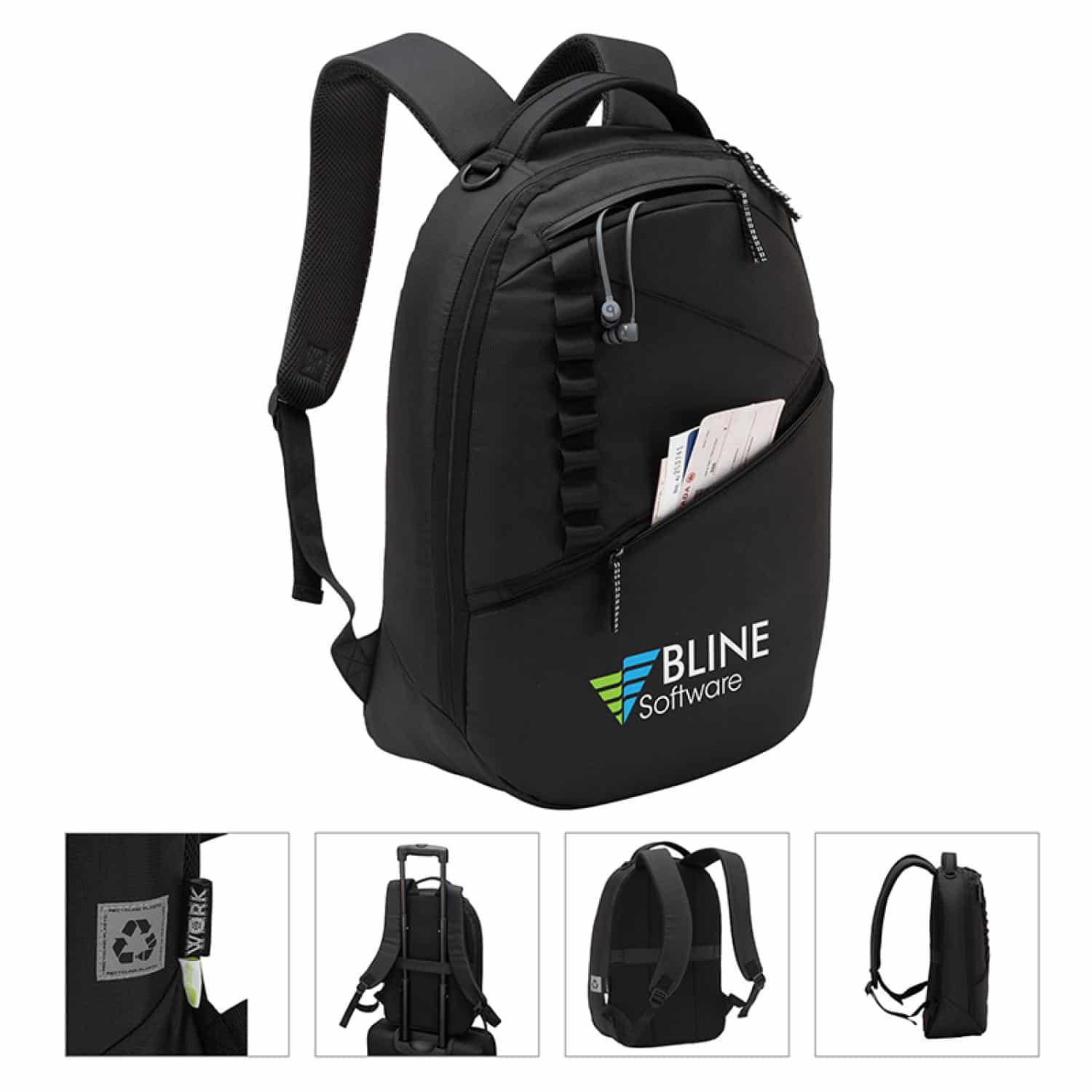 The Work Birmingham Backpack is made with 840 denier recycled polyethylene terephthalate (RPET) that comes from previously used and discarded plastic bottles and is part of the eco-lifestlye collection. It is fully padded and lined with 210D polyester and features a main compartment with padded laptop pocket with safety strap, a zippered pocket and 2 mesh pockets. There is also a top-load zippered accessory pocket, a front zippered pocket, daisy chain and a padded carry handle with two D-rings. Carry it with the fully padded adjustable backpack straps or attach it to your luggage with the backside trolley strap. A portion of all proceeds is donated to Shelter to Soldier, a non-profit organization that rescues dogs to train as service animals for veterans in need. Complies with Prop 65. 12″ W x 17 1/2″ H x 6 1/4″ D