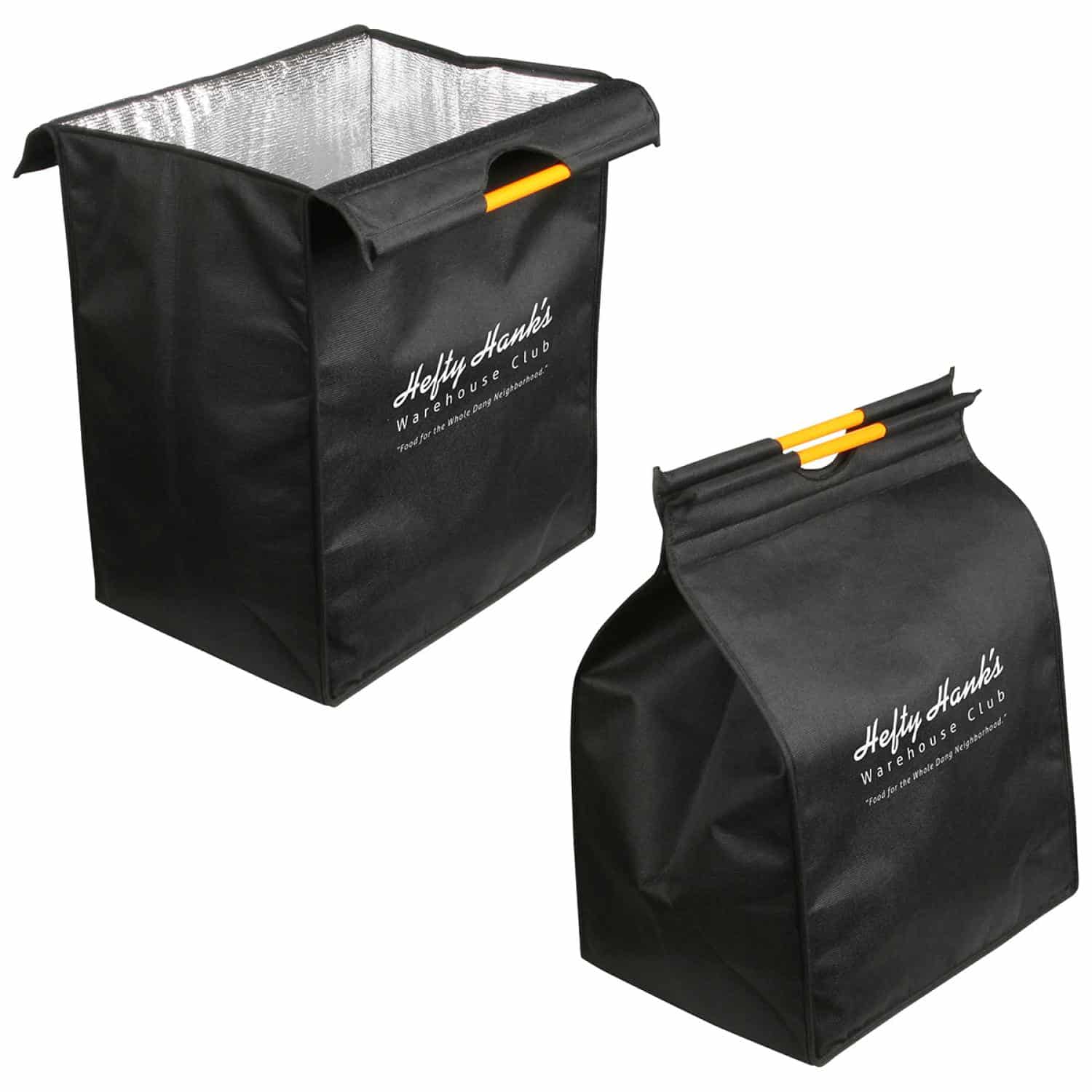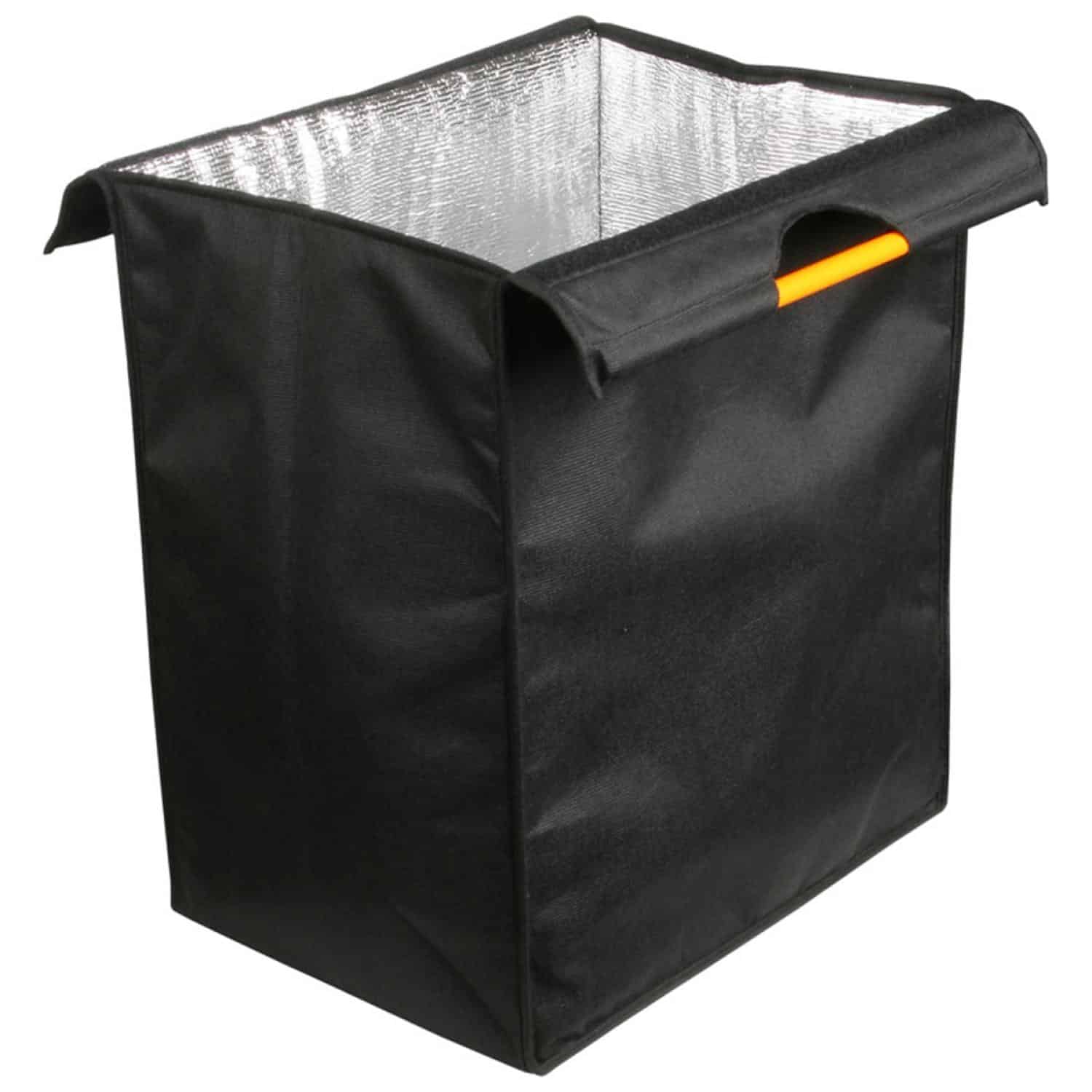 Eco-friendly XL Insulated Recycled PET Shopping Bag is insulated, with a reflective-lined interior, has a hook-and-loop closure, and holds sixty 12 oz beverage cans. Carry with dual rod handles and fold flat for easy storage. Note that recycled PET bags are made from 100% post-consumer water bottles to create a sustainable product that is safe for the environment. GRS Certified. Complies with Prop 65. 16″ L x 11″ W x 21″ H