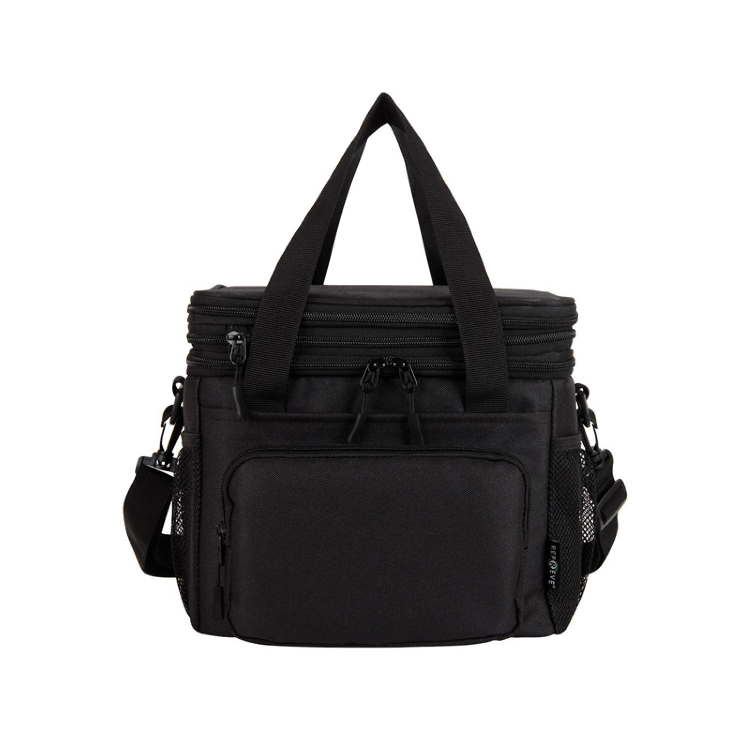 From beach days and picnics to concerts and social gatherings, the Zeph 20-Can / 18L Capacity Cooler Bag keeps your refreshments chilled. Crafted from 600D Repreve recycled ocean plastic, its an eco-friendly choice that helps reduce ocean plastic waste. Designed for versatility and convenience, its heat-sealed PEVA lining is easy to clean and the foam insulation keeps drinks cold for hours. The expandable top compartment, also PEVA-lined with foam insulation, includes an interior mesh pocket providing extra space for sandwiches and snacks. A front zippered pocket and two side mesh pockets keep essentials within reach while on the go. Carry it your way with the removable and adjustable 1 3/8″ x 47″ shoulder strap or use the carry handles for easy transport. Whether you’re heading to a festival, park, or backyard barbecue, this cooler bag is the perfect blend of sustainability, and performance for every adventure. Complies with Prop 65. 10″ W x 9 1/4″ H x 8″ D
